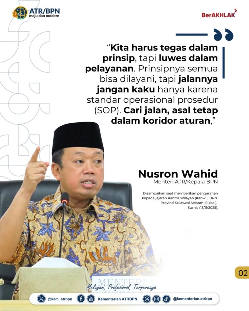 “Kita harus tegas dalam prinsip, tapi luwes dalam pelayanan. Prinsipnya semua bisa dilayani, tapi jalannya jangan kaku hanya karena standar operasional prosedur (SOP). Cari jalan, asal tetap dalam koridor aturan,” tegas Menteri Nusron di hadapan pegawai Kanwil BPN Provinsi Sulsel.