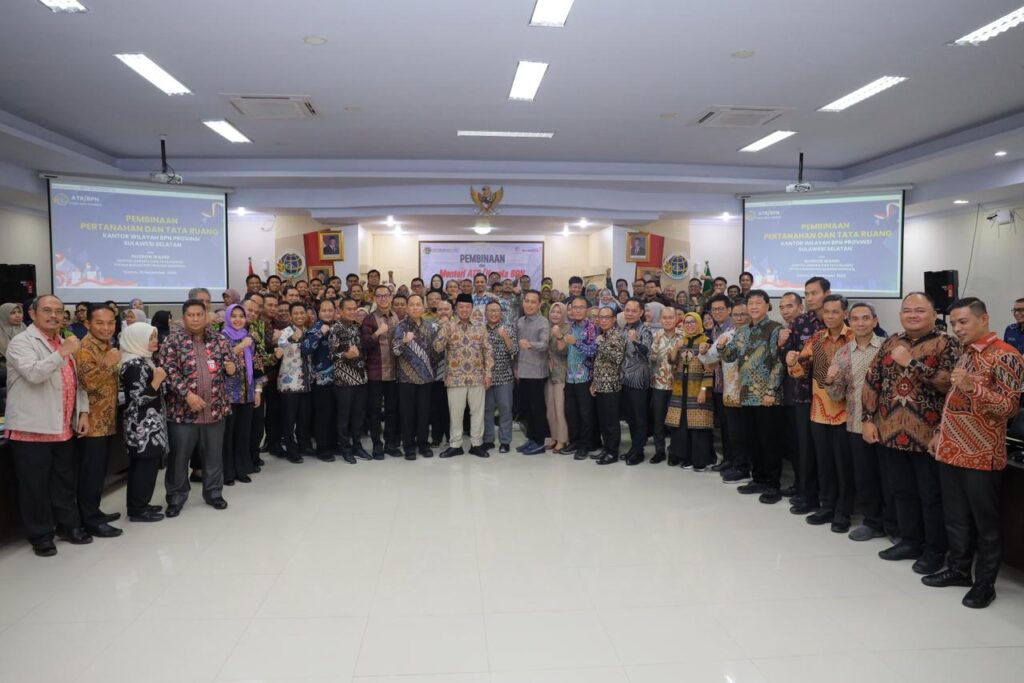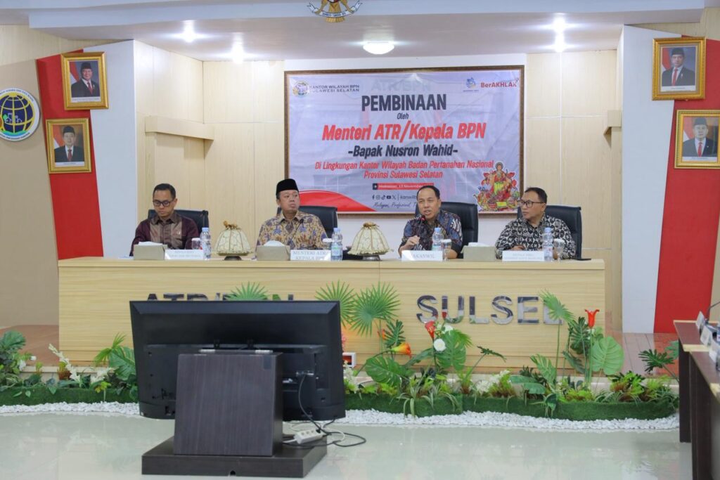 Makassar – Menteri Agraria dan Tata Ruang/Kepala Badan Pertanahan Nasional (ATR/BPN), Nusron Wahid, memberikan pengarahan kepada jajaran Kantor Wilayah (Kanwil) BPN Provinsi Sulawesi Selatan (Sulsel), Kamis (13/11/2025). Salah satu hal yang ia pesankan adalah pentingnya keseimbangan antara ketegasan dalam menjalankan prinsip dan keluwesan dalam memberikan pelayanan untuk masyarakat.