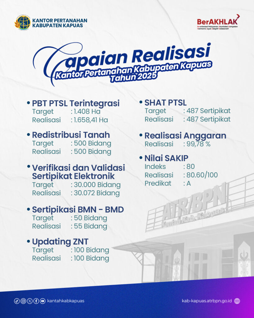 Berikut adalah capaian kinerja Kantor Pertanahan Kabupaten Kapuas Periode Tahun 2025.