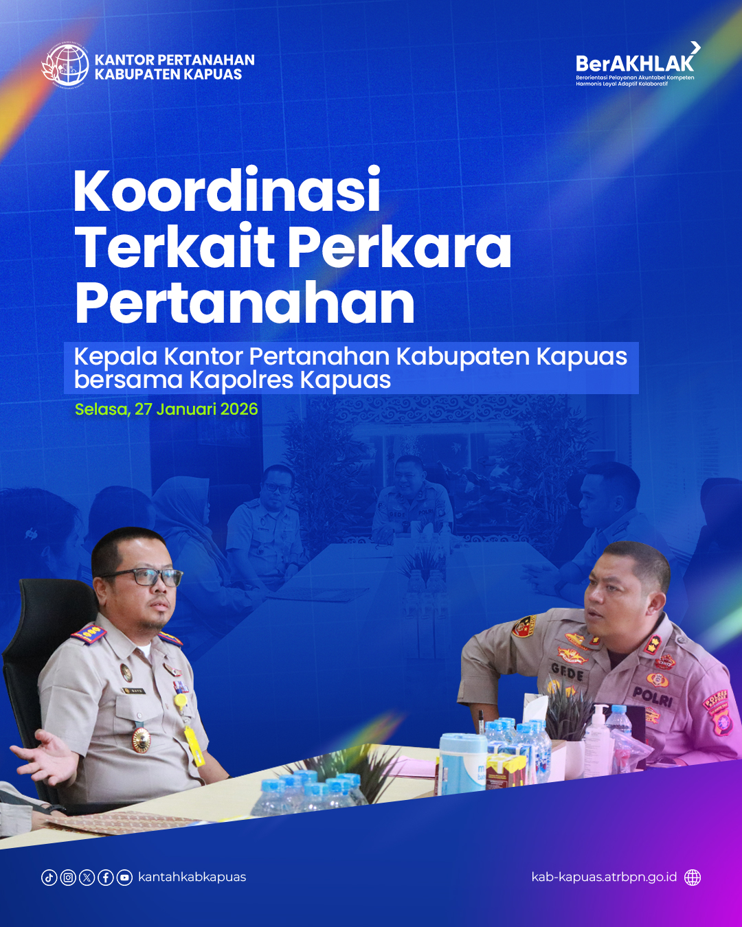 Dalam rangka mewujudkan kepastian hukum dan menyelesaikan berbagai persoalan pertanahan di wilayah Kabupaten Kapuas, Kantor Pertanahan Kabupaten Kapuas melakukan kunjungan koordinasi ke Kepolisian Resor (Polres) Kapuas pada Selasa, 27 Januari […]