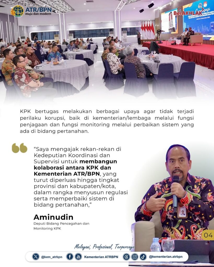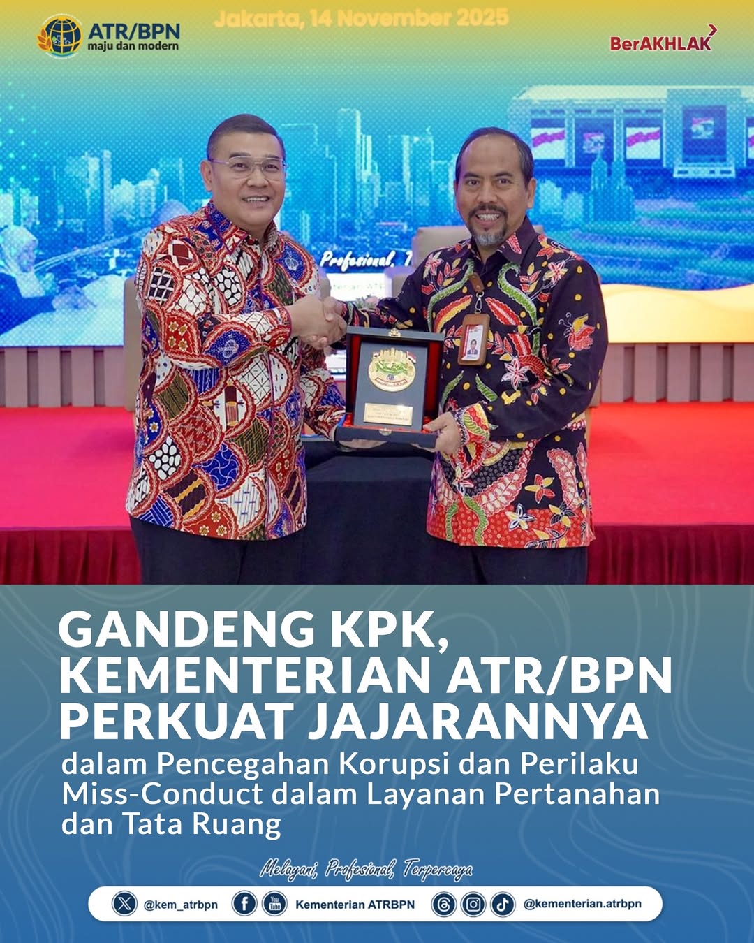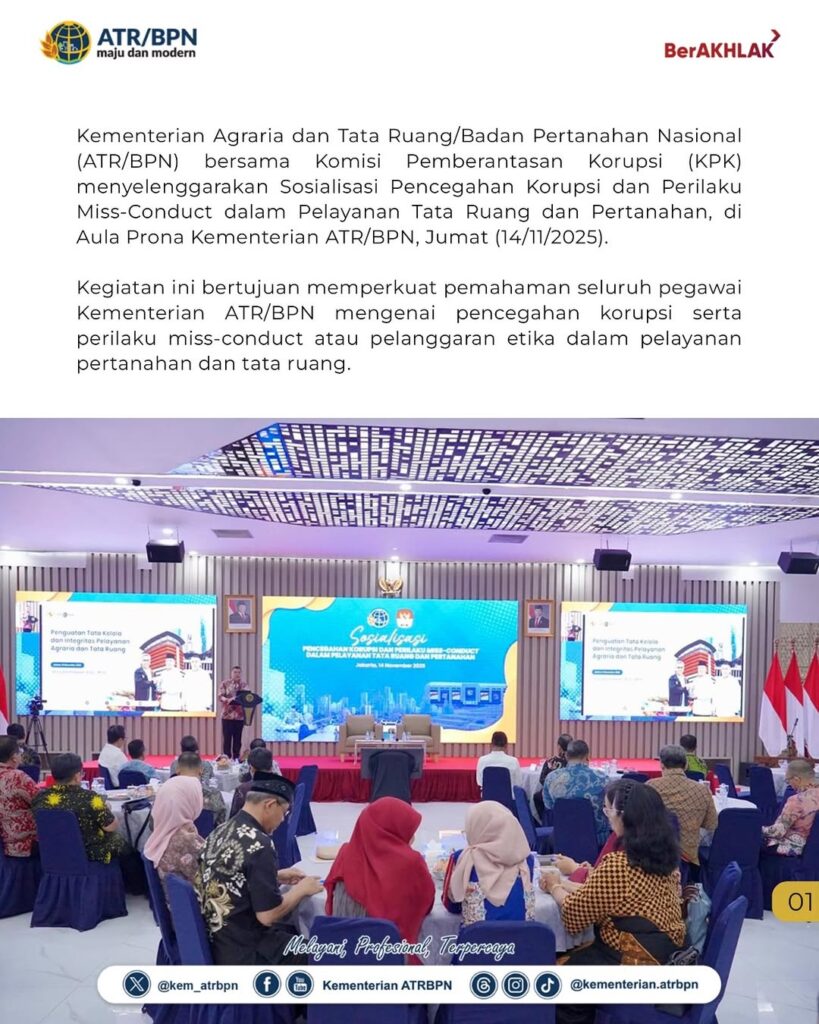 Kementerian Agraria dan Tata Ruang/Badan Pertanahan Nasional (ATR/BPN) bersama Komisi Pemberantasan Korupsi (KPK) menyelenggarakan Sosialisasi Pencegahan Korupsi dan Perilaku Miss-conduct dalam Pelayanan Tata Ruang dan Pertanahan di Aula Prona Kementerian ATR/BPN, Jumat (14/11/2025). Kegiatan ini bertujuan memperkuat pemahaman seluruh pegawai Kementerian ATR/BPN mengenai pencegahan korupsi serta perilaku misconduct atau pelanggaran etika dalam pelayanan pertanahan dan tata ruang.
