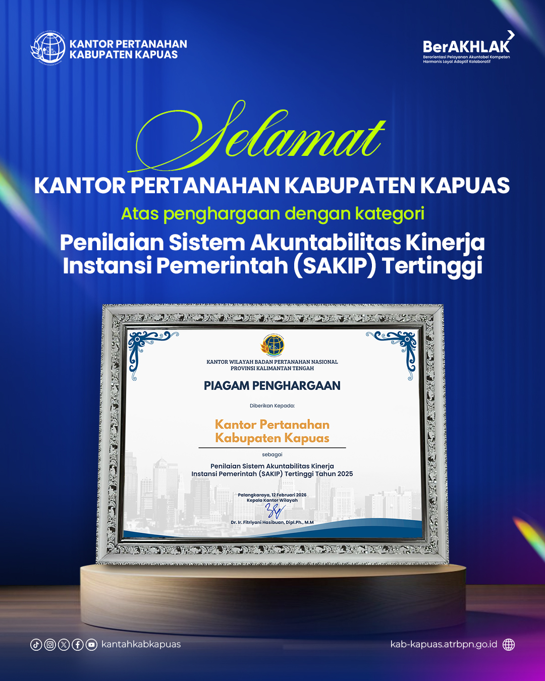 Kantor Pertanahan Kabupaten Kapuas berhasil meraih penghargaan dengan kategori Penilaian Sistem Akuntabilitas Kinerja Instansi Pemerintah (SAKIP) Tertinggi di lingkungan Kanwil BPN Provinsi Kalimantan Tengah Tahun Anggaran 2025.
