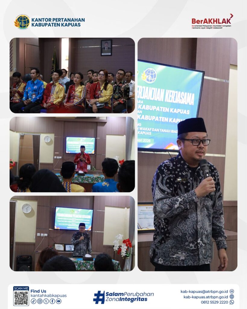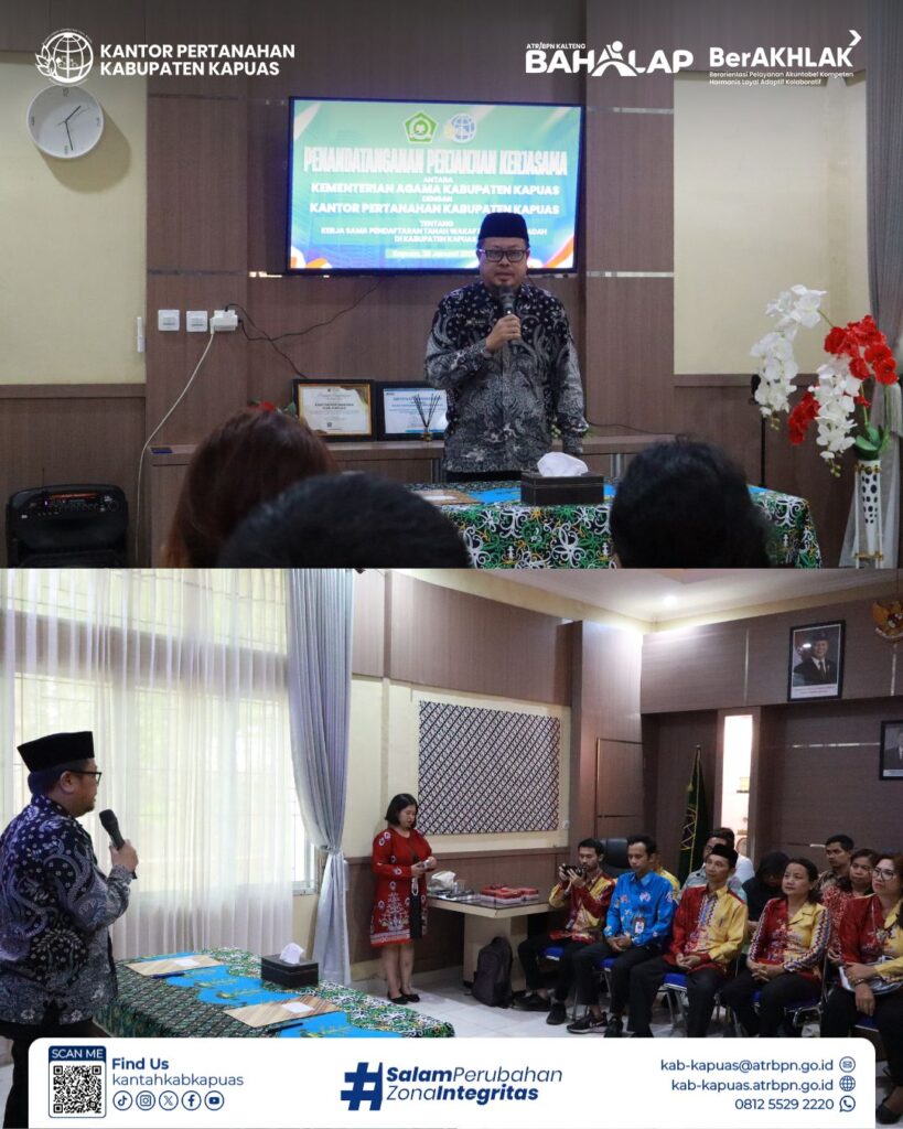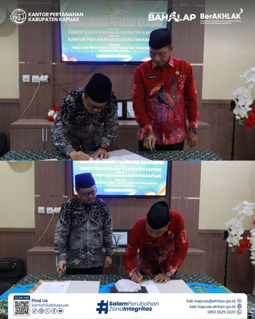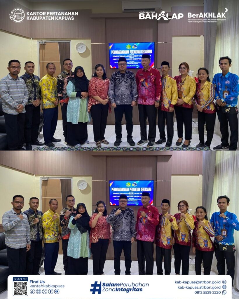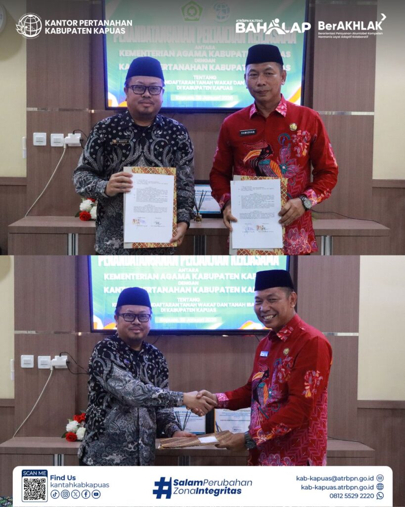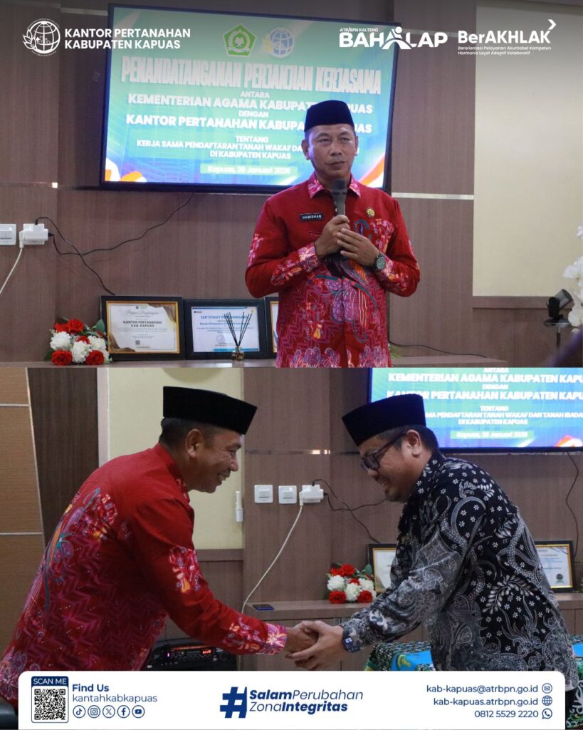 Langkah nyata untuk melindungi aset umat! Kantor Pertanahan Kabupaten Kapuas resmi memperkuat sinergi dengan Kementerian Agama Kabupaten Kapuas melalui penandatanganan perjanjian kerja sama terkait pendaftaran tanah wakaf dan tanah ibadah.