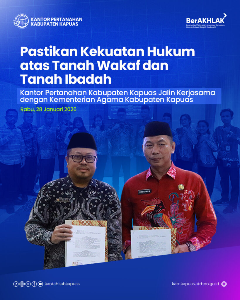 Melalui kolaborasi erat antara Kantor Pertanahan Kabupaten Kapuas dan Kementerian Agama Kabupaten Kapuas, kami berkomitmen untuk mempermudah dan mempercepat pendaftaran tanah wakaf serta rumah ibadah sesuai dengan arahan Menteri ATR/BPN Nusron Wahid khususnya untuk wilayah Kabupaten Kapuas.