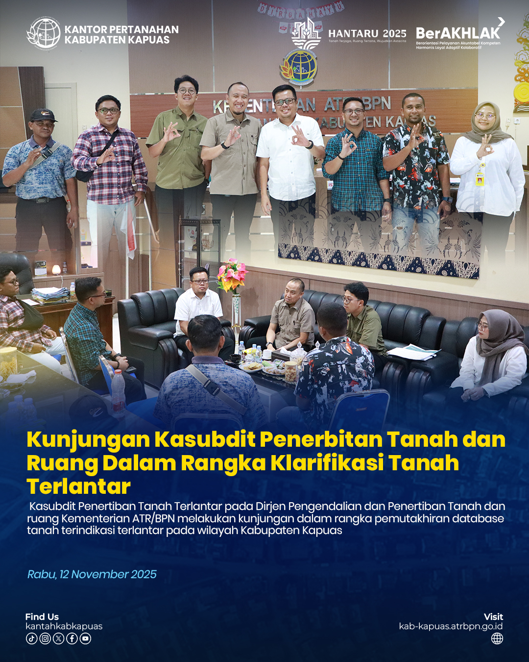Kapuas – 12 November 2025 Kasubdit Penertiban Tanah Terlantar pada Dirjen Pengendalian dan Penertiban Tanah dan ruang Kementerian ATR/BPN melakukan kunjungan ke Kantor Pertanahan Kabupaten Kapuas.