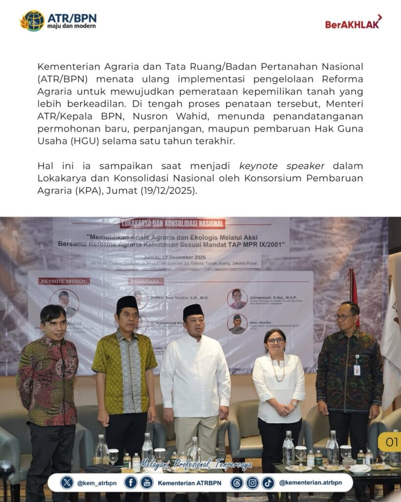 Kementerian Agraria dan Tata Ruang/Badan Pertanahan Nasional (ATR/BPN) menata ulang implementasi pengelolaan Reforma Agraria untuk mewujudkan pemerataan kepemilikan tanah yang lebih berkeadilan. Di tengah proses penataan tersebut, Menteri ATR/Kepala BPN, Nusron Wahid, menunda penandatanganan permohonan baru, perpanjangan, maupun pembaruan Hak Guna Usaha (HGU) selama satu tahun terakhir.