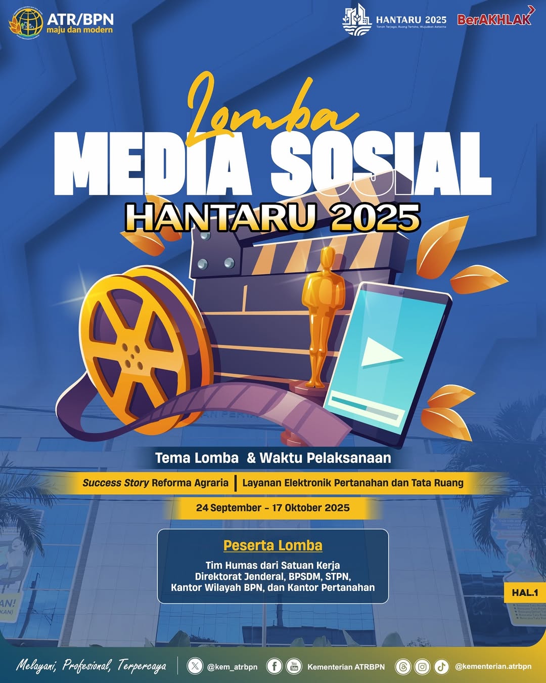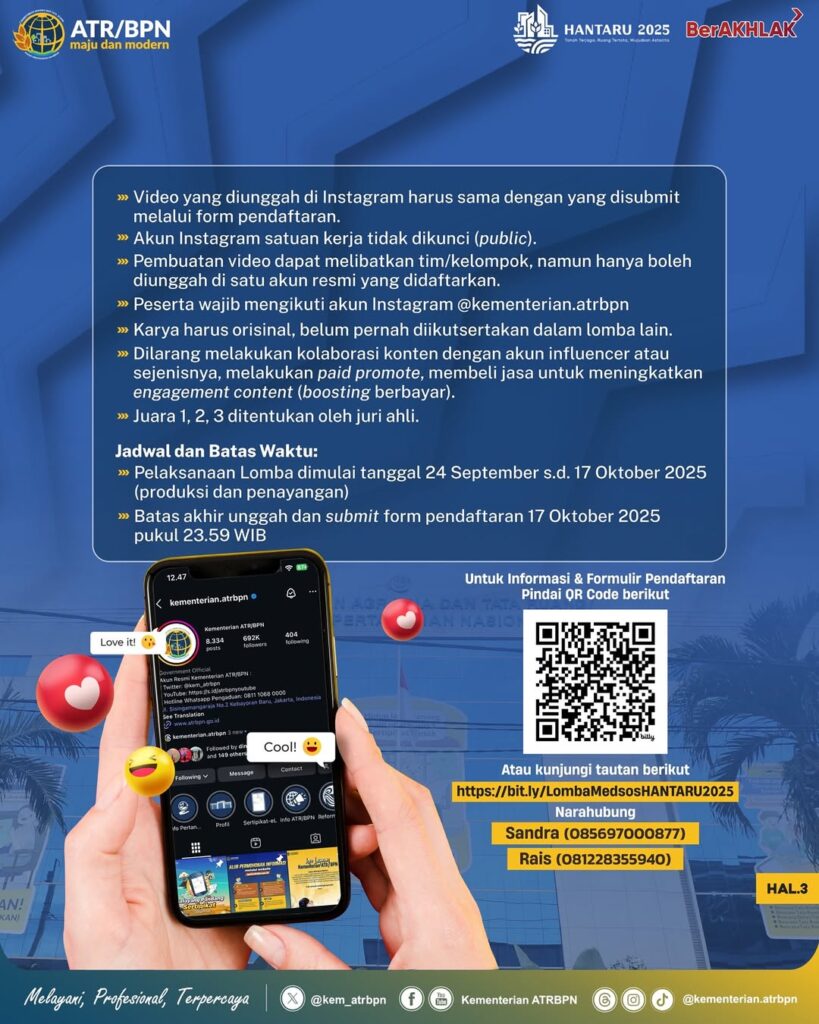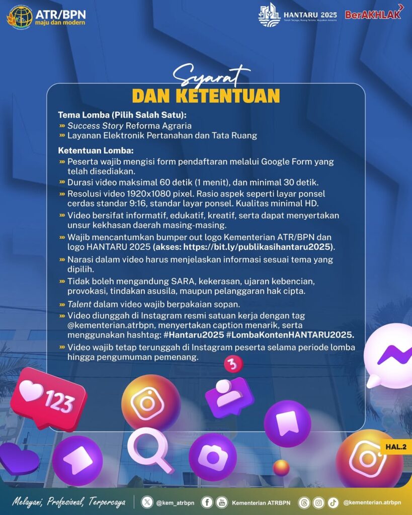 Halo #SobATRBPN, dalam rangkaian perayaan Hari Agraria dan Tata Ruang (HANTARU) 2025, Kementerian ATR/BPN akan menyelenggarakan Lomba Konten Media Sosial.