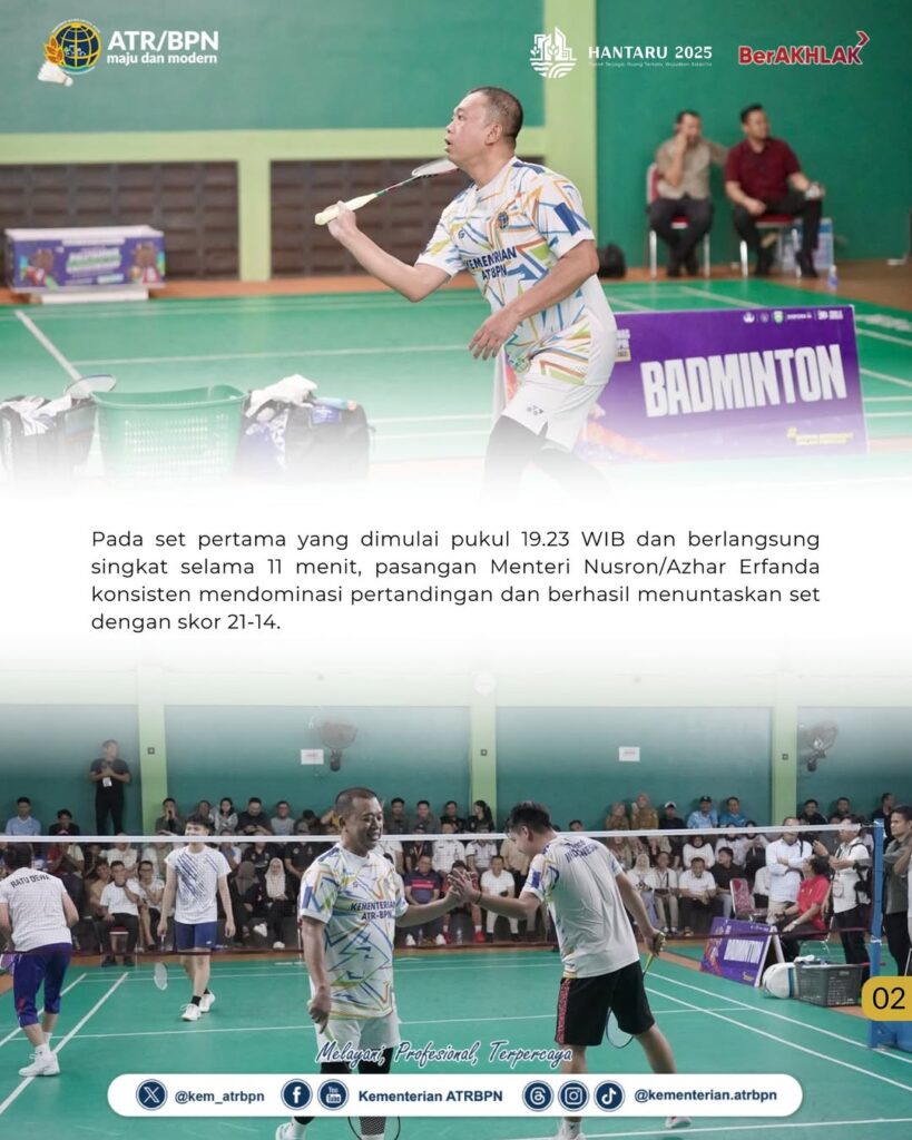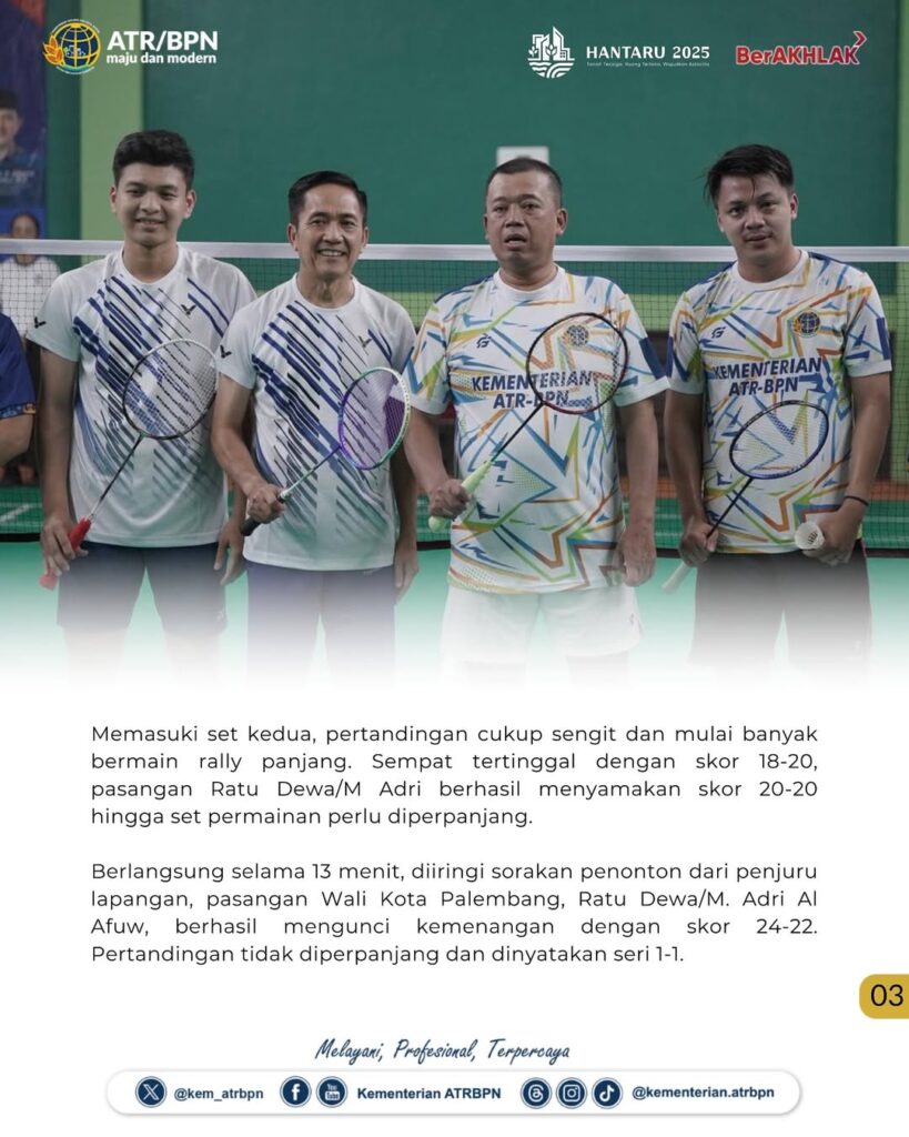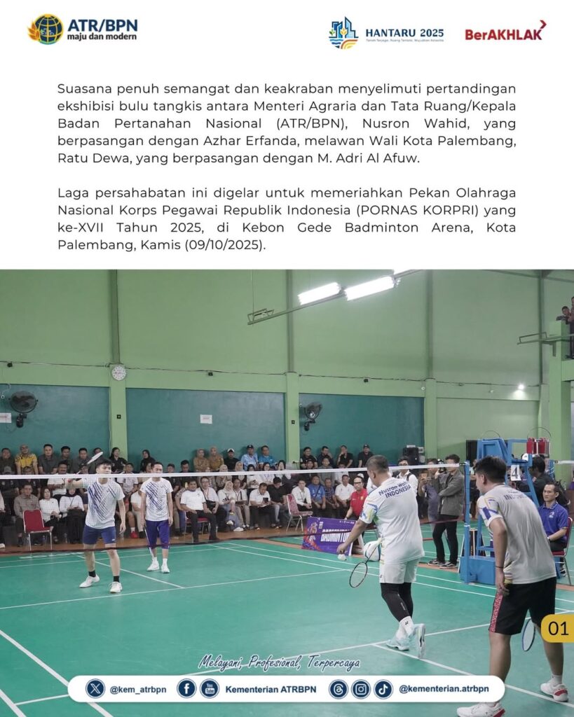 Suasana penuh semangat dan keakraban menyelimuti pertandingan ekshibisi bulu tangkis antara Menteri Agraria dan Tata Ruang/Kepala Badan Pertanahan Nasional (ATR/BPN), Nusron Wahid, yang berpasangan dengan Azhar Erfanda, melawan Wali Kota Palembang, Ratu Dewa, yang berpasangan dengan M. Adrie Al Afuw.