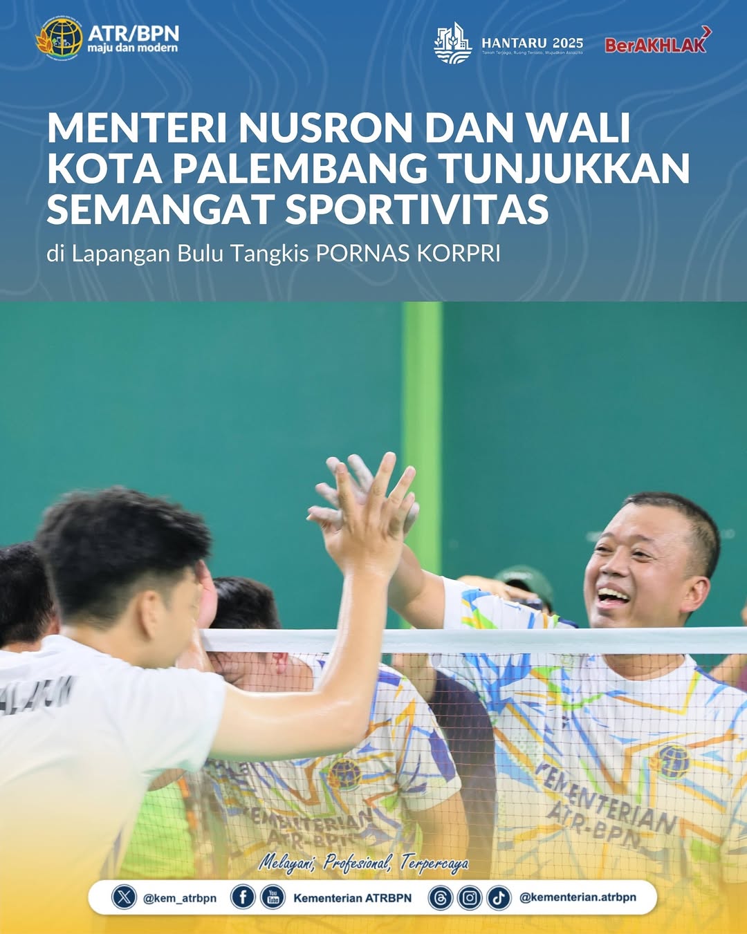 Suasana penuh semangat dan keakraban menyelimuti pertandingan ekshibisi bulu tangkis antara Menteri Agraria dan Tata Ruang/Kepala Badan Pertanahan Nasional (ATR/BPN), Nusron Wahid, yang berpasangan dengan Azhar Erfanda, melawan Wali Kota Palembang, Ratu Dewa, yang berpasangan dengan M. Adrie Al Afuw.