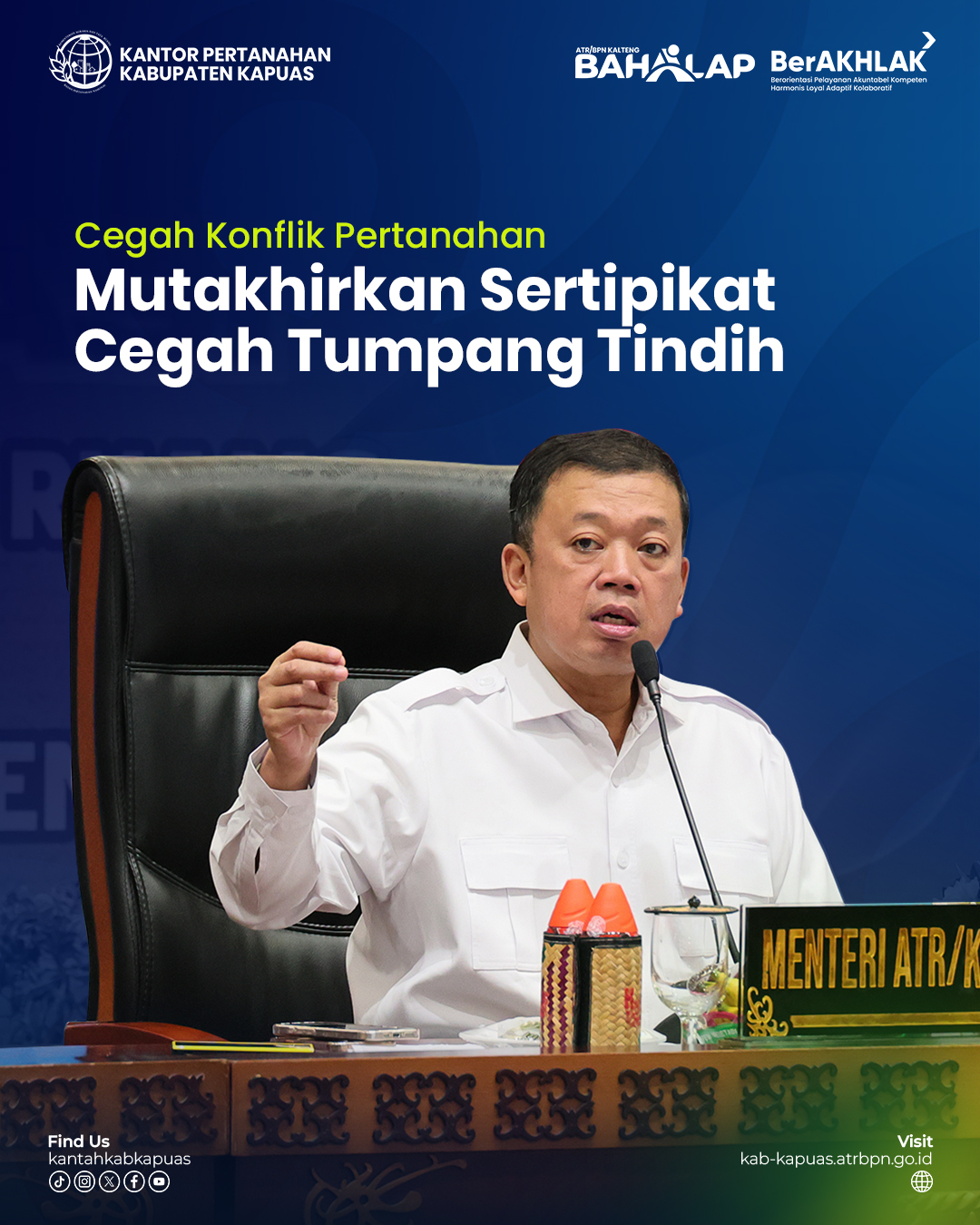 Menteri ATR/BPN, Nusron Wahid dalam rangka kunjungan kerja ke Kalimantan Tengah meminta Pemerintah Daerah se-Kalimantan Tengah (Kalteng) mengambil langkah cepat untuk memutakhirkan sertipikat keluaran lama.
