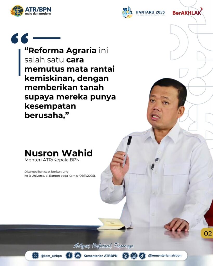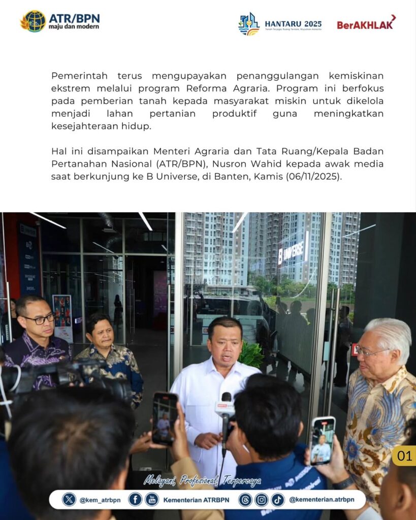 “Kalau soal memberikan tanah untuk masyarakat sangat miskin agar bisa dikelola, khususnya di sektor pertanian itu namanya program Reforma Agraria. Sudah ada keputusan pemerintah untuk itu. Reforma Agraria ini salah satu cara memutus mata rantai kemiskinan, dengan memberikan tanah supaya mereka punya kesempatan berusaha,” ujar Menteri ATR/Kepala BPN, Nusron Wahid, saat berkunjung ke B Universe, di Banten, Kamis (06/11/2025).