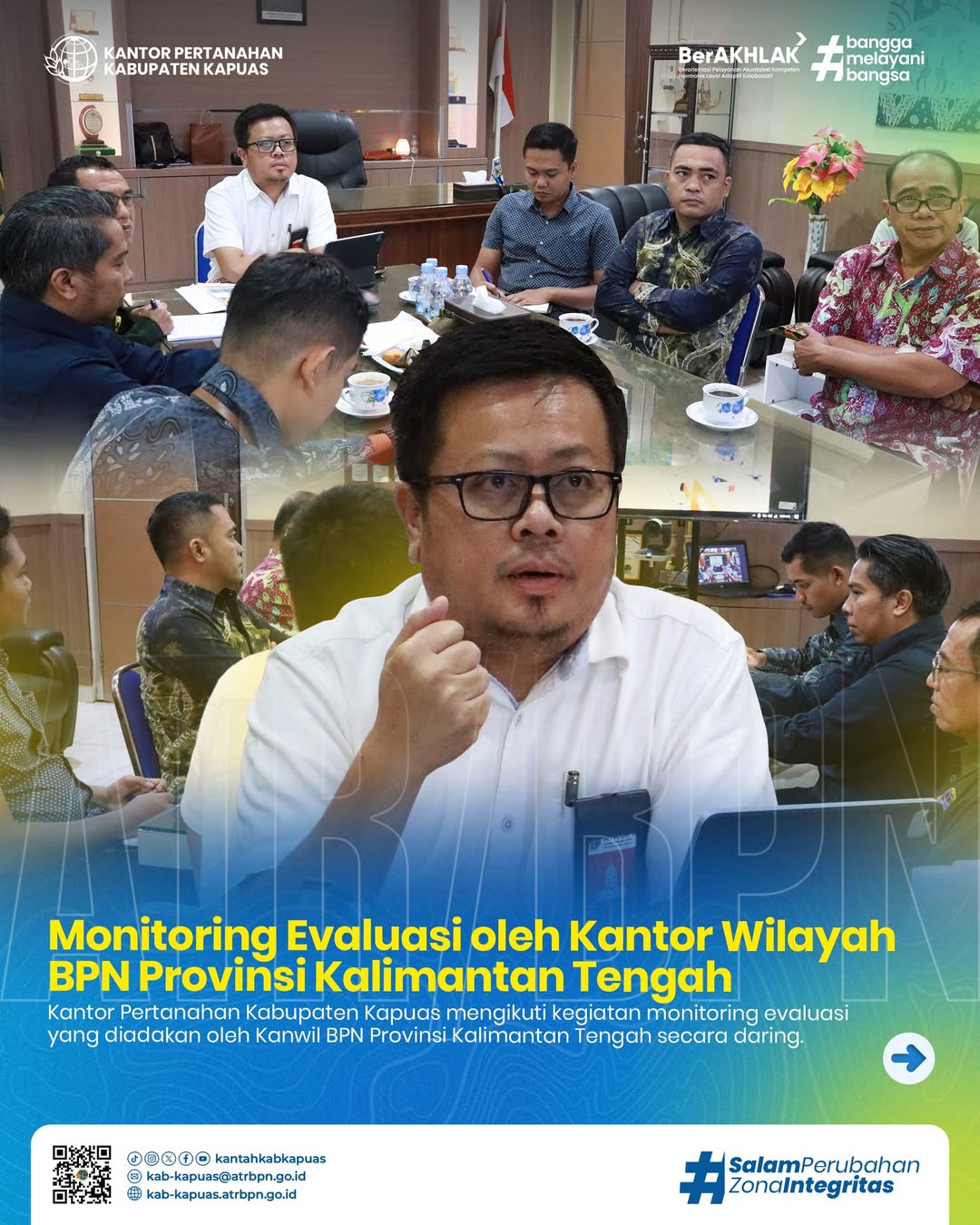 Kantor Pertanahan Kabupaten Kapuas mengikuti kegiatan Monitoring Evaluasi oleh Kantor Wilayah BPN Provinsi Kalimantan Tengah secara during melalui zoom.