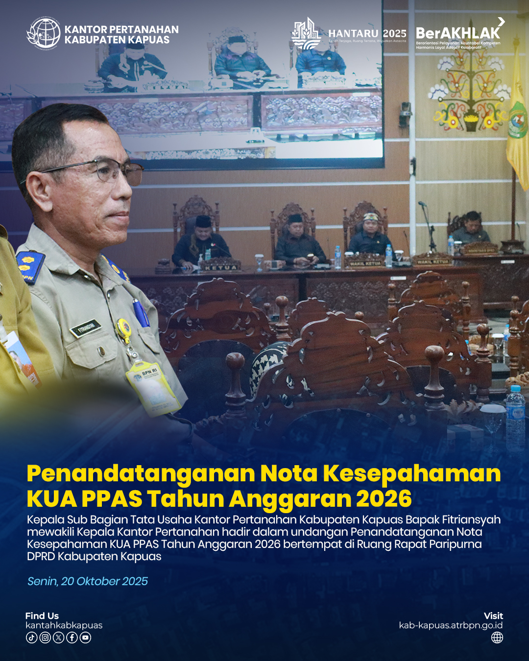 Kepala Kantor Pertanahan Kabupaten Kapuas diwakili oleh Kepala SubBagian Tata Usaha menghadiri undangan Penandatanganan Nota Kesepahaman KUA PPAS Tahun Anggaran 2026 bertempat di Ruang Rapat Paripurna DPRD Kabupaten Kapuas, Senin 20 Oktober 2025.