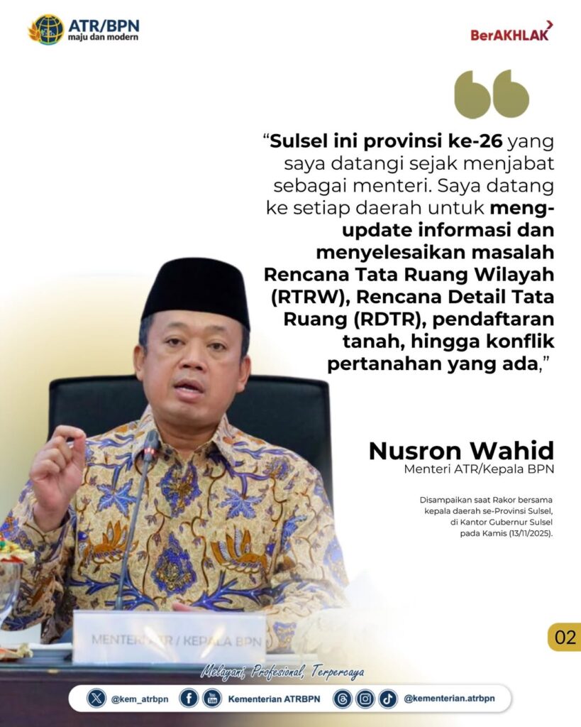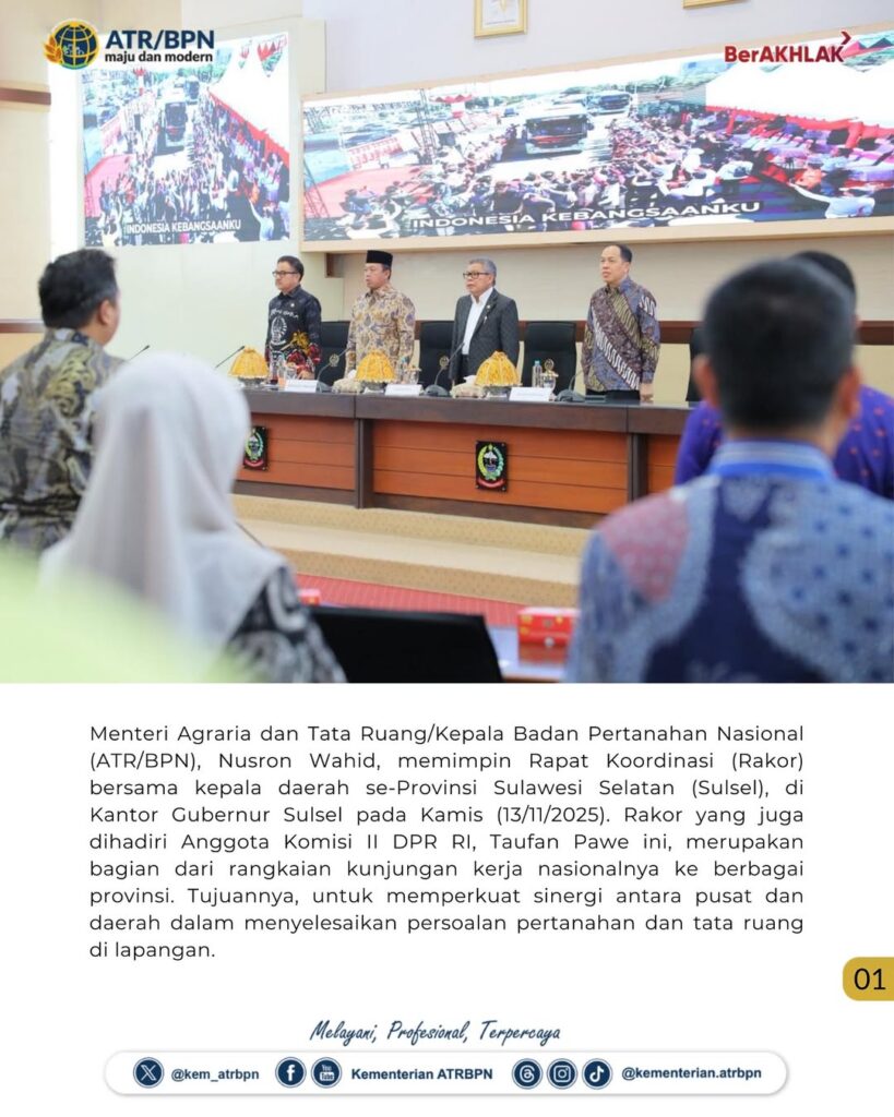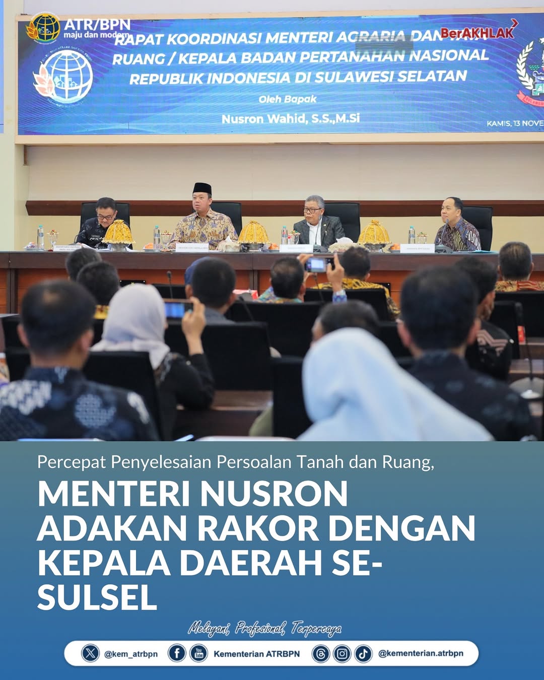 Menteri Agraria dan Tata Ruang/Kepala Badan Pertanahan Nasional (ATR/BPN), Nusron Wahid, memimpin Rapat Koordinasi (Rakor) bersama kepala daerah se-Provinsi Sulawesi Selatan (Sulsel), di Kantor Gubernur Sulsel pada Kamis (13/11/2025). Rakor ini merupakan bagian dari rangkaian kunjungan kerja nasionalnya ke berbagai provinsi. Tujuannya, untuk memperkuat sinergi antara pusat dan daerah dalam menyelesaikan persoalan pertanahan dan tata ruang di lapangan.