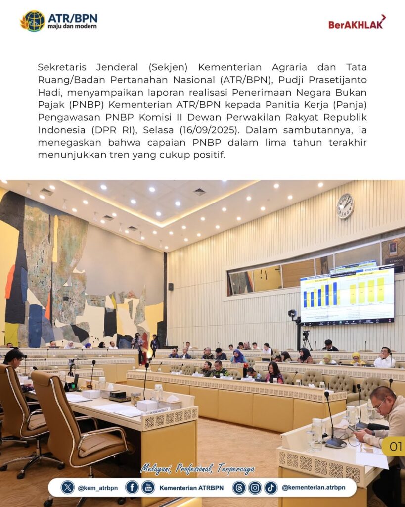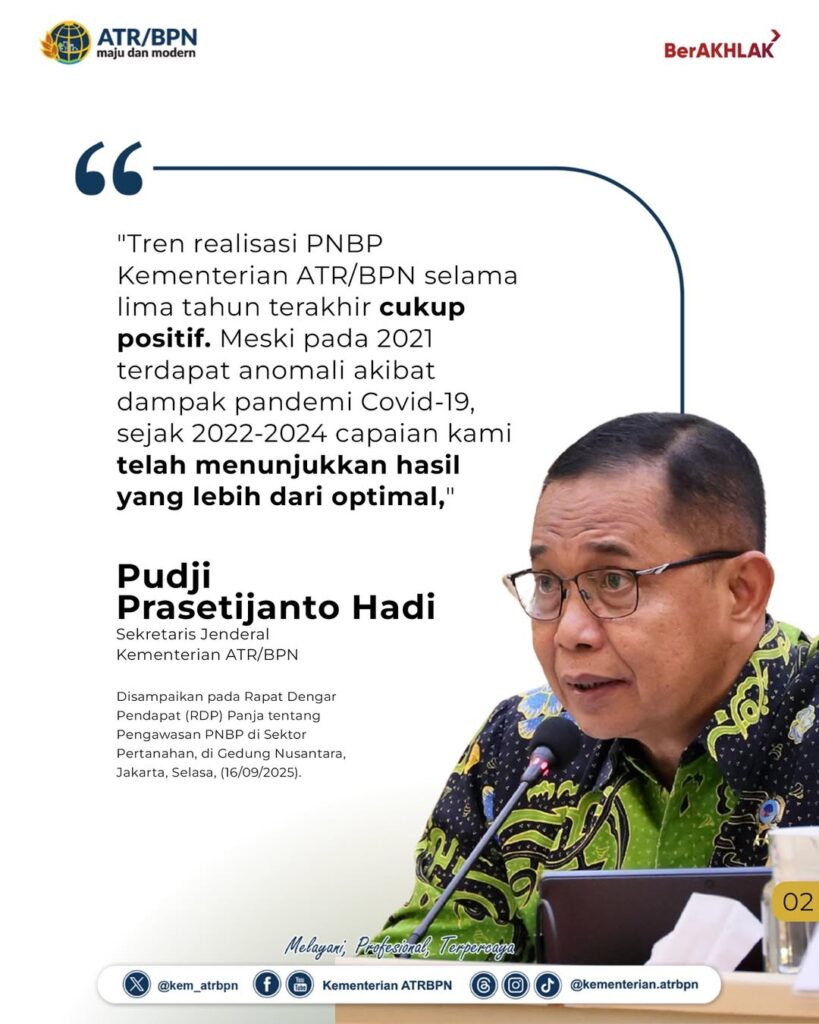 Sekretaris Jenderal (Sekjen) Kementerian Agraria dan Tata Ruang/Badan Pertanahan Nasional (ATR/BPN), Pudji Prasetijanto Hadi, menyampaikan laporan realisasi Penerimaan Negara Bukan Pajak (PNBP) Kementerian ATR/BPN kepada Panitia Kerja (Panja) Pengawasan PNBP Komisi II Dewan Perwakilan Rakyat Republik Indonesia (DPR RI), Selasa (16/09/2025).