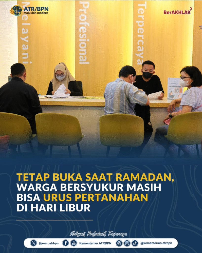 Jakarta – Memasuki bulan Ramadan, kebutuhan masyarakat dalam mengurus sertipikat tanah tidak surut. Hal ini terlihat di Kantor Pertanahan (Kantah) Kota Administrasi Jakarta Barat, di mana masyarakat tetap memanfaatkan Pelayanan Tanah Akhir Pekan (PELATARAN). Layanan yang dibuka setiap hari Sabtu dan Minggu ini memudahkan masyarakat pekerja untuk mendapatkan pelayanan pertanahan, termasuk untuk mengurus peralihan hak waris.