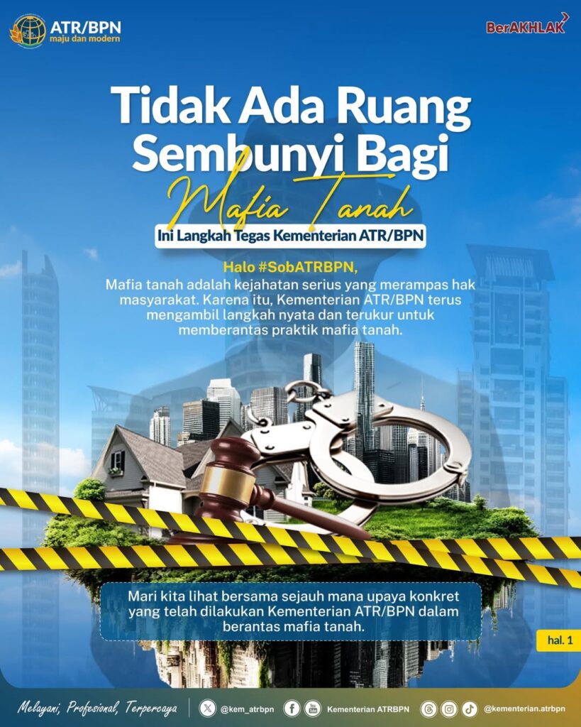 Halo #SobATRBPN, mafia tanah merupakan kejahatan serius yang merampas hak masyarakat. Untuk itu, Kementerian ATR/BPN terus mengambil langkah nyata dan terukur dalam memberantas praktik mafia tanah.